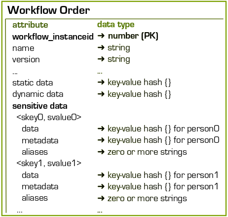 Workflow order sensitive data is stored separately for each data subject against the workflow order using two identifiers (in addition to the workflow_instanceid designating the workflow order); within the order, each data subject's sensitive data is identified with the following keys: