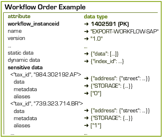 The following image provides an overview of a concrete example of sensitive data stored against a workflow order storing sensitive data for at least two data subjects with tax_ids "984.302192.AF" and "739.323.714.BR":